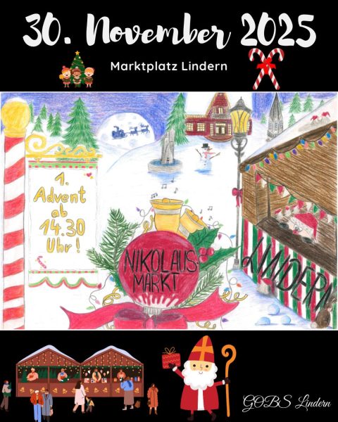 Am Sonntag, den 30. November 2025, findet ab 14:30 Uhr der traditionelle Nikolausmarkt auf dem Marktplatz in Lindern statt. Auch die GOBS Lindern ist mit einem eigenen Stand vertreten. Wir freuen uns auf zahlreiche Besucherinnen und Besucher und eine stimmungsvolle Einstimmung auf die Adventszeit.